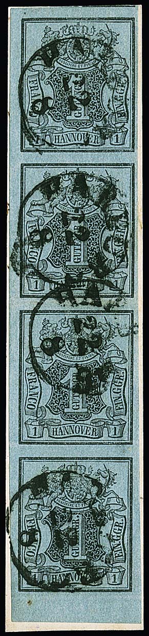 1 Ggr. schw./graublau, seltener senkrechter Viererstreifen vom Unterrand, allseits voll- bis breitrandig, unten mit Bogenrand, auf Briefstück mit K1 "Harburg", mittig nur im Zwischenraum Bugspur. Sign. Kruschel, Salomon, Attest Berger. Mi. 4000,-, aus der Burrus-Slg.
