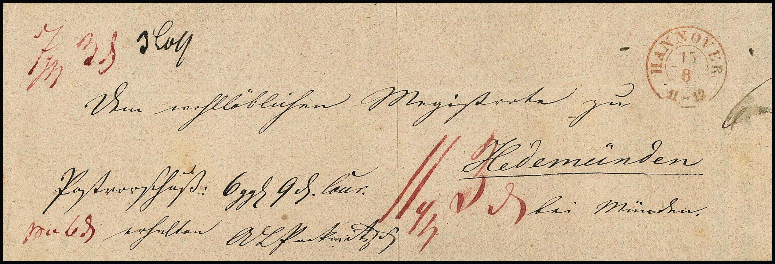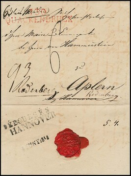 "Hannover", 1813, 31.5., klarer L1 nebst L1 "DEBOURSÉS" und Datumsstempel auf Kabinettbrief (Irrläufer) mit rotem L2 "130 QUACKENBRUCK" nach Aplern bei Hannover, geändert in Aplern bei Rodenberg (diverse Taxen), ein sehr seltenes Poststück, ArGe 09, 2250,- + 225,-