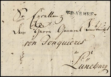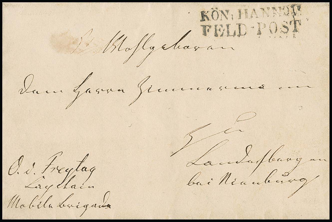 Feldpost, 1794, 29.3., Ypern/Westflandern, kleiner, rückseitig unkompletter Brief mit sehr seltenem L1 "V.D. ARMEE" nach Lüneburg, es sind nur wenige Belegstücke bekannt, beiliegend ein Erlass, Feuser 331, 1500,-. Im Jahre 1792 veranlasste König Georg III. die Aufstellung eines Hannoverschen Korps von ca. 13.000 Mann, die im englischen Sold standen. Bei diesem Korps, welches in Flandern ab Mai 1793 einsatzbereit war, befand sich auch ein von der Königlich Kurfürstlichen Hannoverschen Post eingerichtetes Feldpostamt. Wie aus der Verordnung vom 22. Mai 1793 hervorgeht, bestand eine Briefbeförderung von Hannover bzw. Nienburg nach Lüttich und zurück zu den sich in den Niederlanden befindlichen Truppen der Hannoveraner. Von Lüttich wurden die Briefe durch die in den Niederlanden tätige Thurn und Taxis-Post zu den Hannoverschen Truppen weiterbefördert. Portofreiheit bestand für Briefe des Militärs von und bis Lüttich. Für die Weiterbeförderung in den Niederlanden verzichtete die Postverwaltung von Thurn und Taxis auf 1/4 des gewöhnlichen Portos (abgebildet im ArGe-Handbuch)