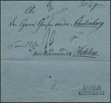 "Hameln" und "DÉBOURSES" (1808), je klare L1 rs. auf Briefhülle mit vs. L1 "GOETTINGEN", sowie hs. "par Bodenwerder" und "Taxe d`Elze" an den Grafen von Schulenburg in Hehlen, eine große Rarität