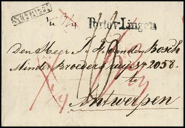 "Schapen", 1838, sehr seltener Negativstempel (Ra1) nebst L1 "PORTO V. LINGEN" auf kleinem Kabinettbrief nach Antwerpen, Feuser 3123-2, 1500,-, ArGe Liebhaberpreis (nur drei Abschläge bekannt)