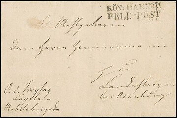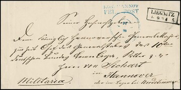 Feldpost, 1858, 6.9., "LIEGNITZ", Ra2 auf Militariacouvert an Generalmajor von Sichard, z.Z. Chef des Generalstabs des 10. deutschen Bundes-Armeecorps in Hannover "oder im Lager bei Nordstemmen", vorderseitig L2 "KÖN. HANNOV. FELDPOST" und stummer Datums-K2 vom 17.9.(1858), von größter Seltenheit, Feuser 93, 3000,-. Der gleiche Stempel wurde später noch mit einem zusätzlichen blauen Zweikreisstempel ohne Ortsangabe, aber mit Datum bei einer Truppenübung des X. Bundeskorps bei Nordstemmen vom 12.-23. September 1858 eingesetzt. Rückseitig nochmals der stumme Zweikreisstempel in blau mit Datum 17.9. und Ankunftsstempel "ELZE 18. Sept.". Für die Zeit des Manövers war in Nordstemmen eine Feldpostexpedition eingerichtet worden, die von der bestehenden Postexpedition in Elze mit Arbeitshilfen versorgt wurde (ex Slg. Dieter Springer)