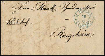 Feldpost, 1866, 19.6., Rossdorf (bei Göttingen), kleiner "Soldatenbrief" mit blauem K2 "K.HANNOV. FELDPOST" nach Ringelheim, es handelt sich um den ersten Verwendungstag des Stempels in diesem Krieg (Laufzeit 19.-28.6.1866, am 29.6. kapitulierte die hann. Armee in Langensalza), Feuser 91, 1500,- (nur einige Belege bekannt)