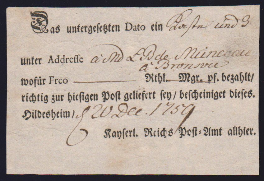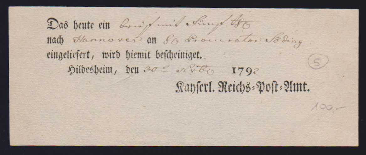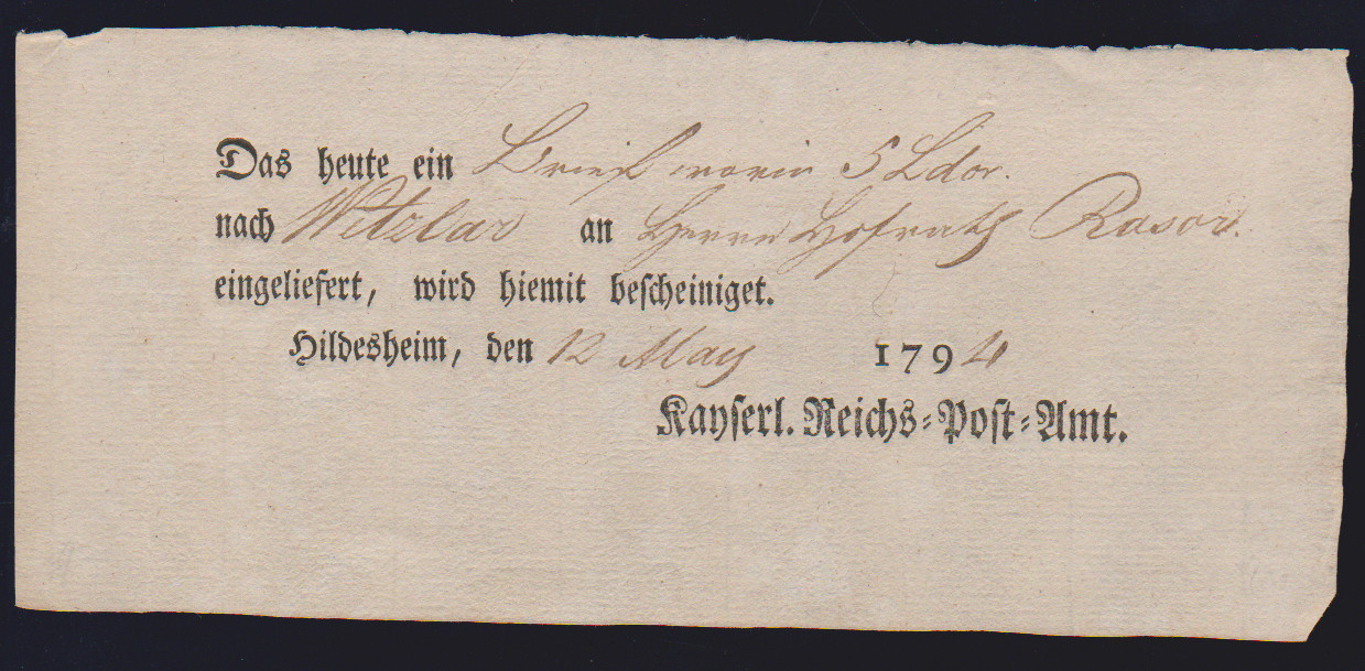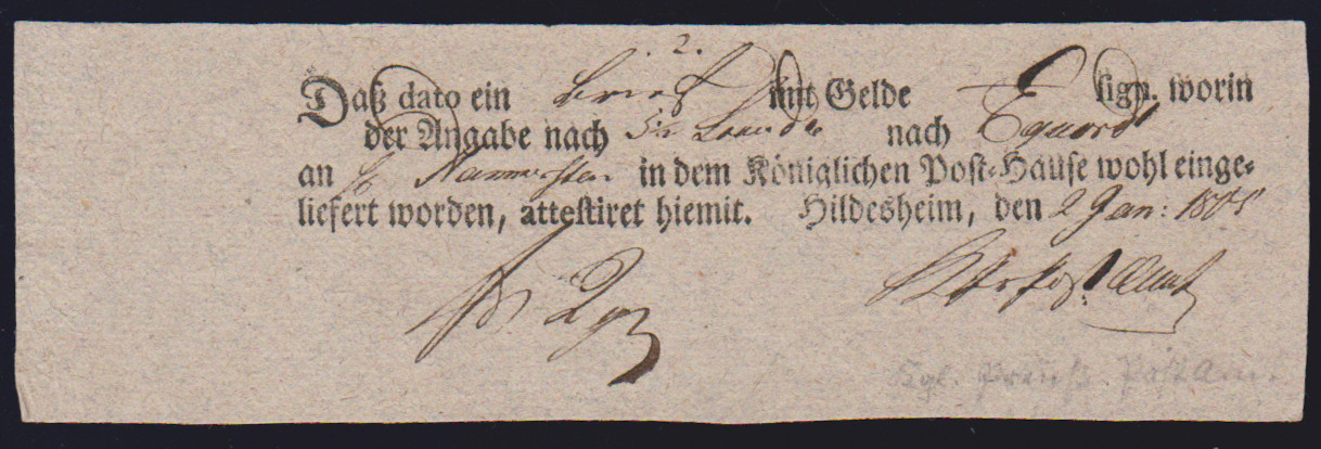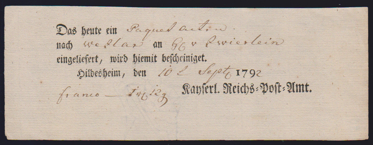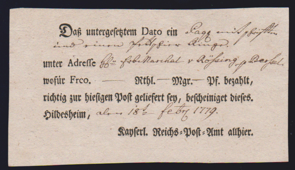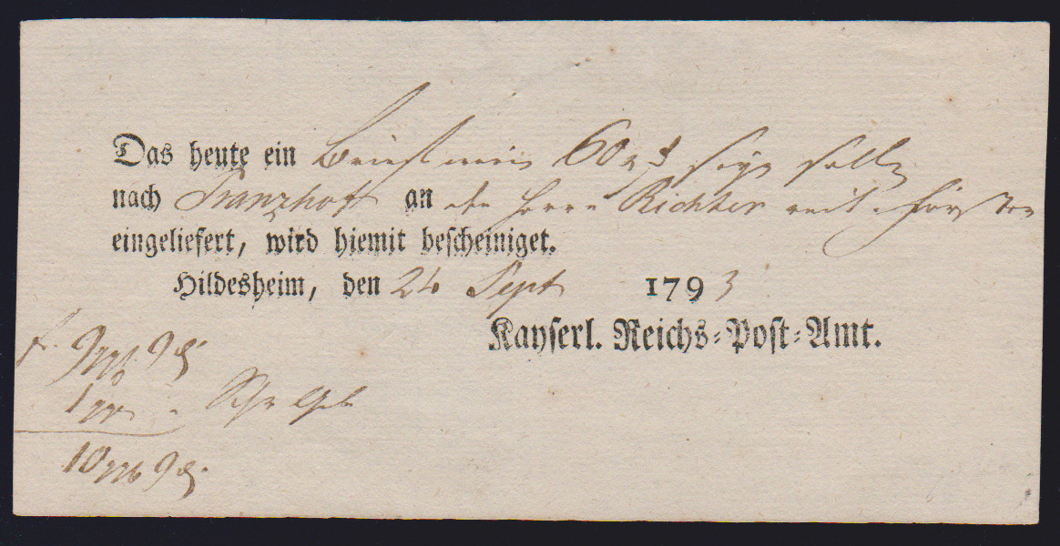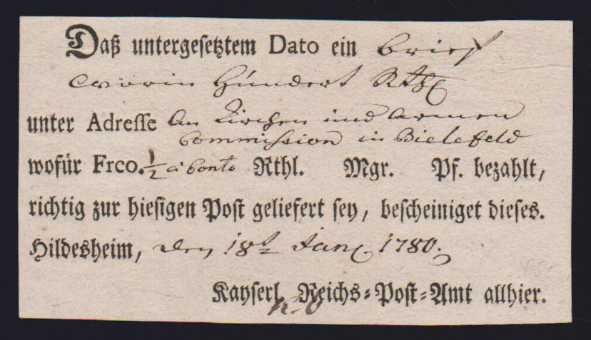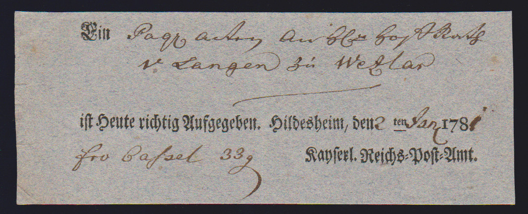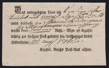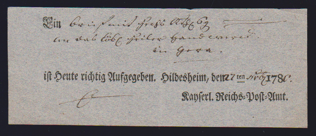 "Hildesheim", 1766-1807, zehn Reichspostscheine, meist Ortsdruck (einer hs., eine Zeitungsquittung)
