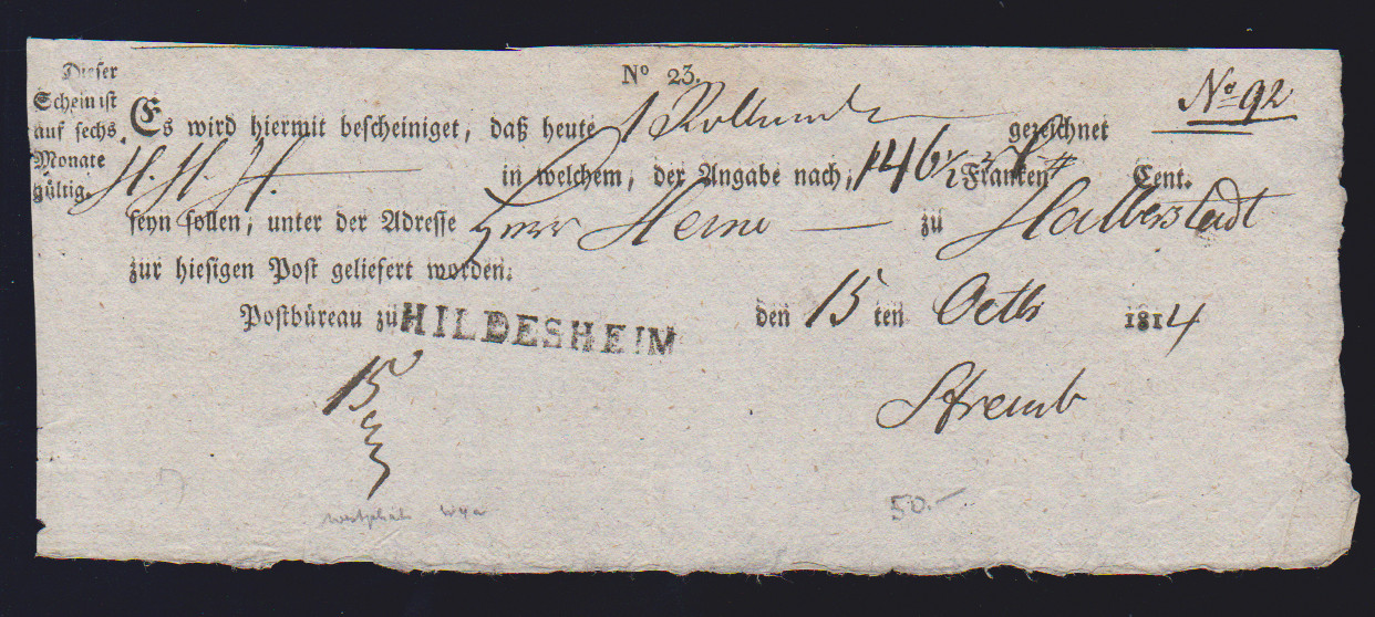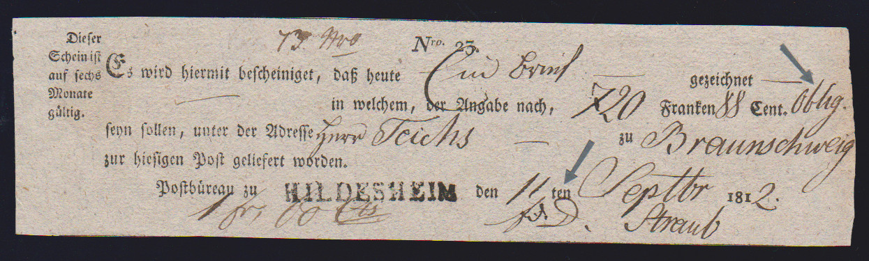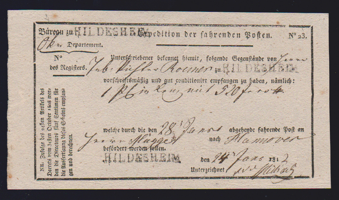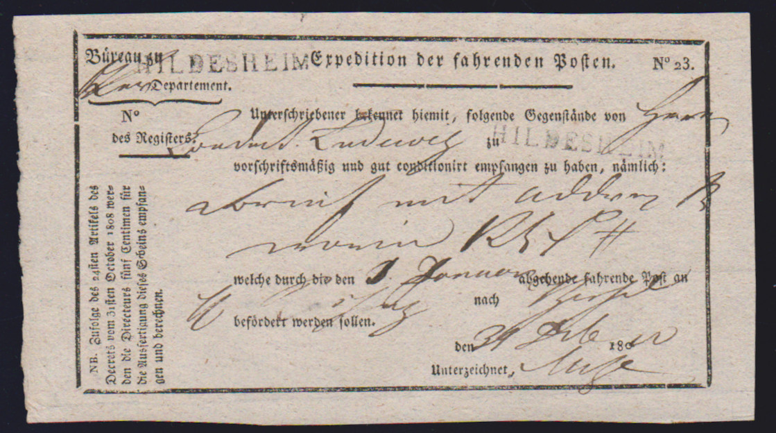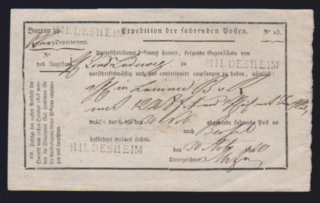 "Hildesheim", 1810-1814, je L1 auf fünf westphälischen Postscheinen