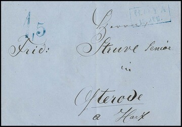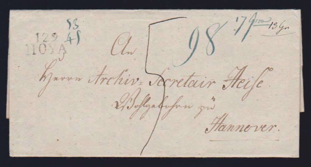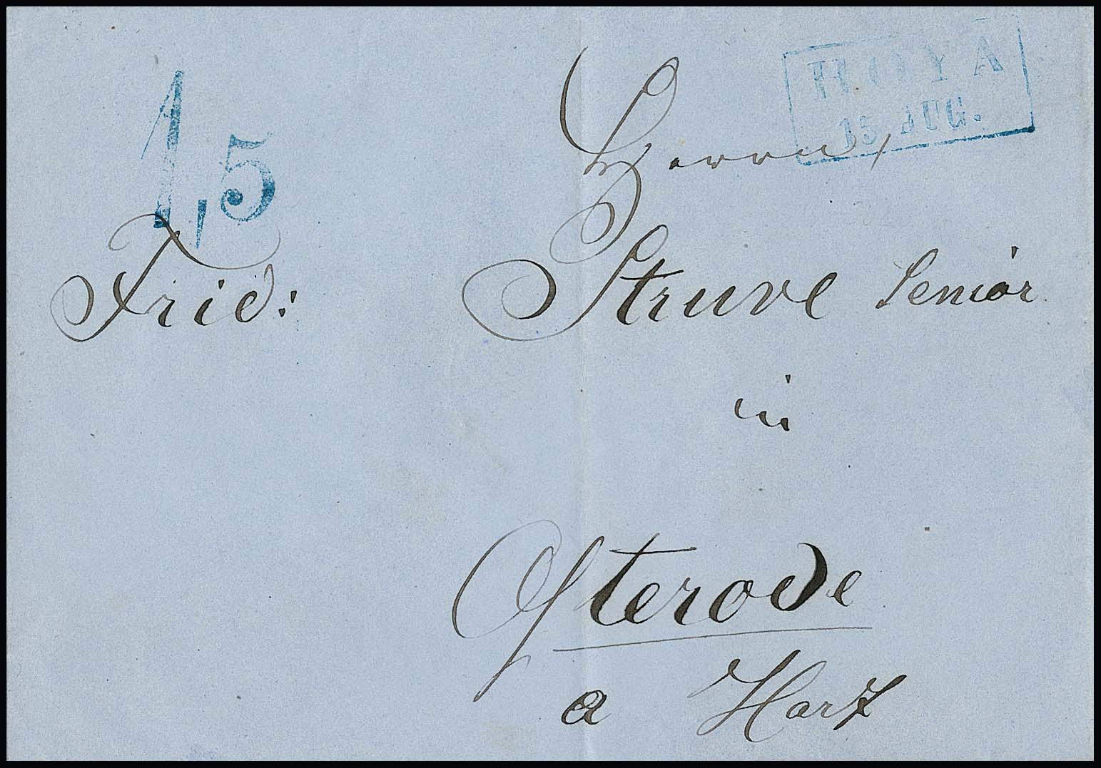 "Hoya", 1860, blauer Ra2 nebst sehr seltenem Taxstempel "1,5" auf Brief nach Osterode, ArGe 600,-