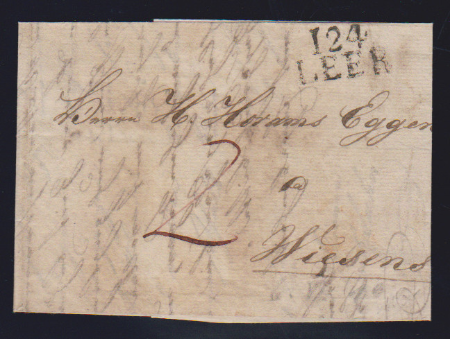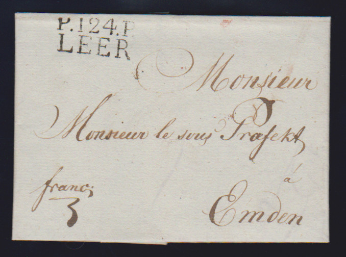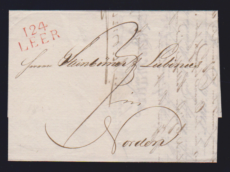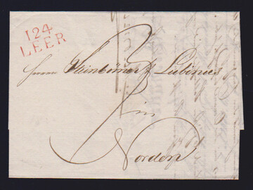 "Leer", 1813, 26.7., sehr klarer roter L2 "124 LEER" auf Luxusbrief, späte Verwendung des nicht aptierten Departementstempels