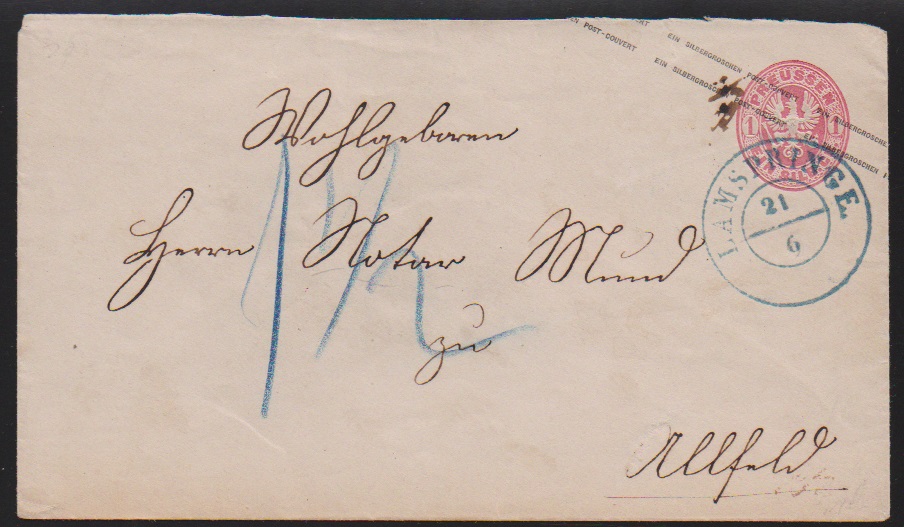"Lamspringe", nachverw. blauer K2 auf Preußen-Ganzsache 1 Sgr., mit Nachtaxe "1 1/2" nach Alfeld