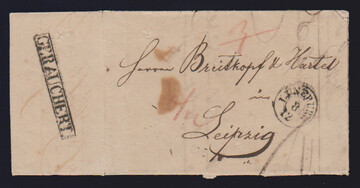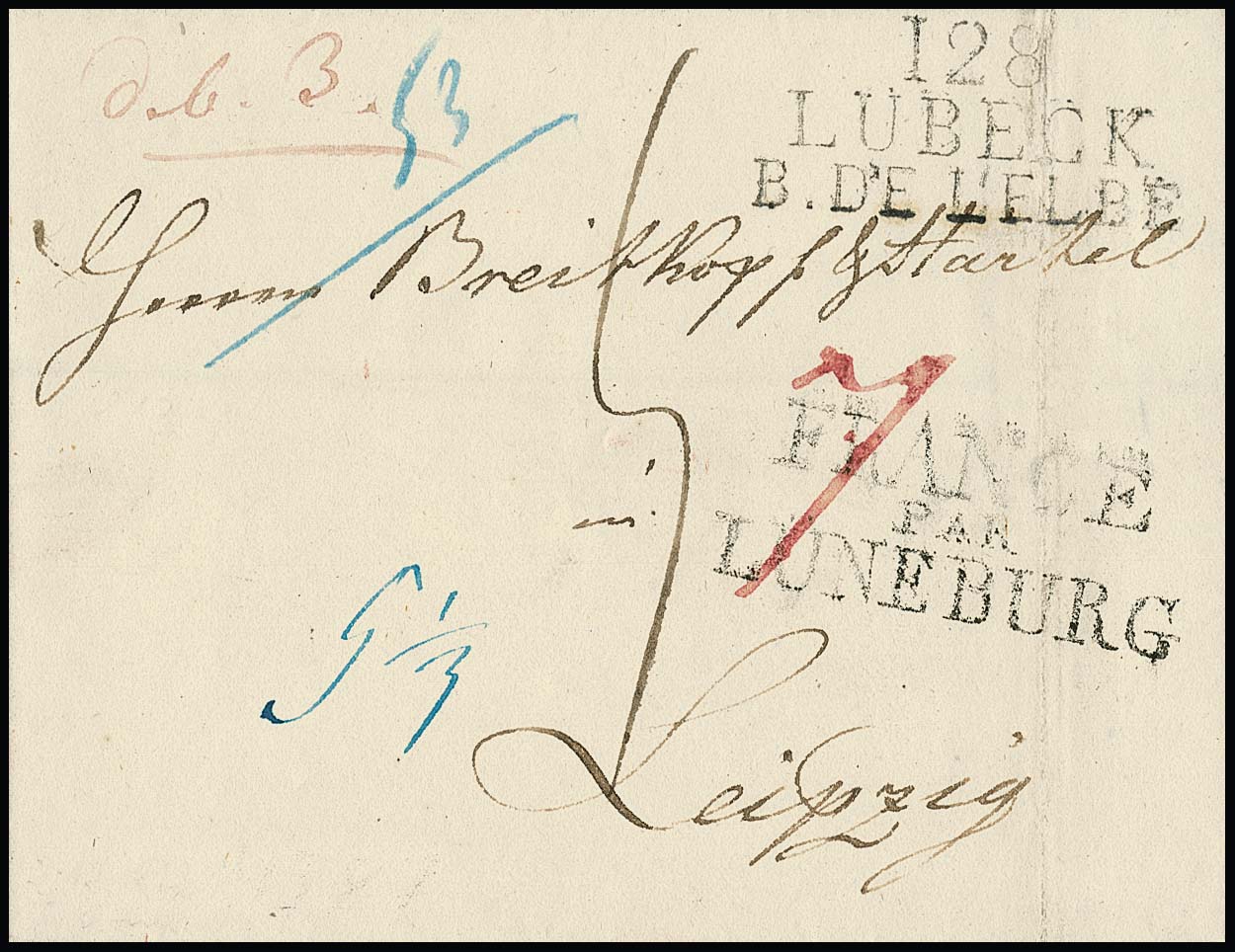 "Lübeck", 1812, "128 LUBECK B. DE L`ELBE" und "FRANCE PAR LUNEBURG", je klare L3 auf kleinem Brief (Falte) nach Leipzig