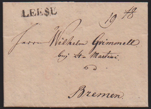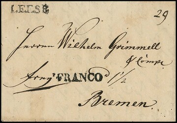 "Leese", 1809, westphäl. L1 (dazu weiterer Brief mit L1 "FRANCO"), zwei Kabinettbriefe aus gleicher Korrespondenz aus Stolzenau nach Bremen, ein schönes und seltenes Paar, ArGe 750,- (ex Slg. Kampczyk)