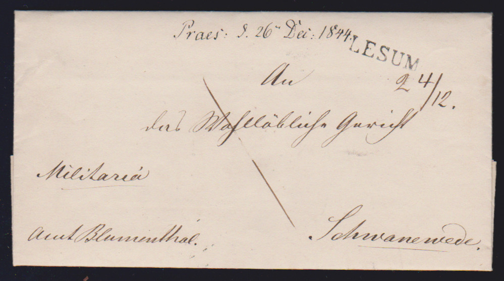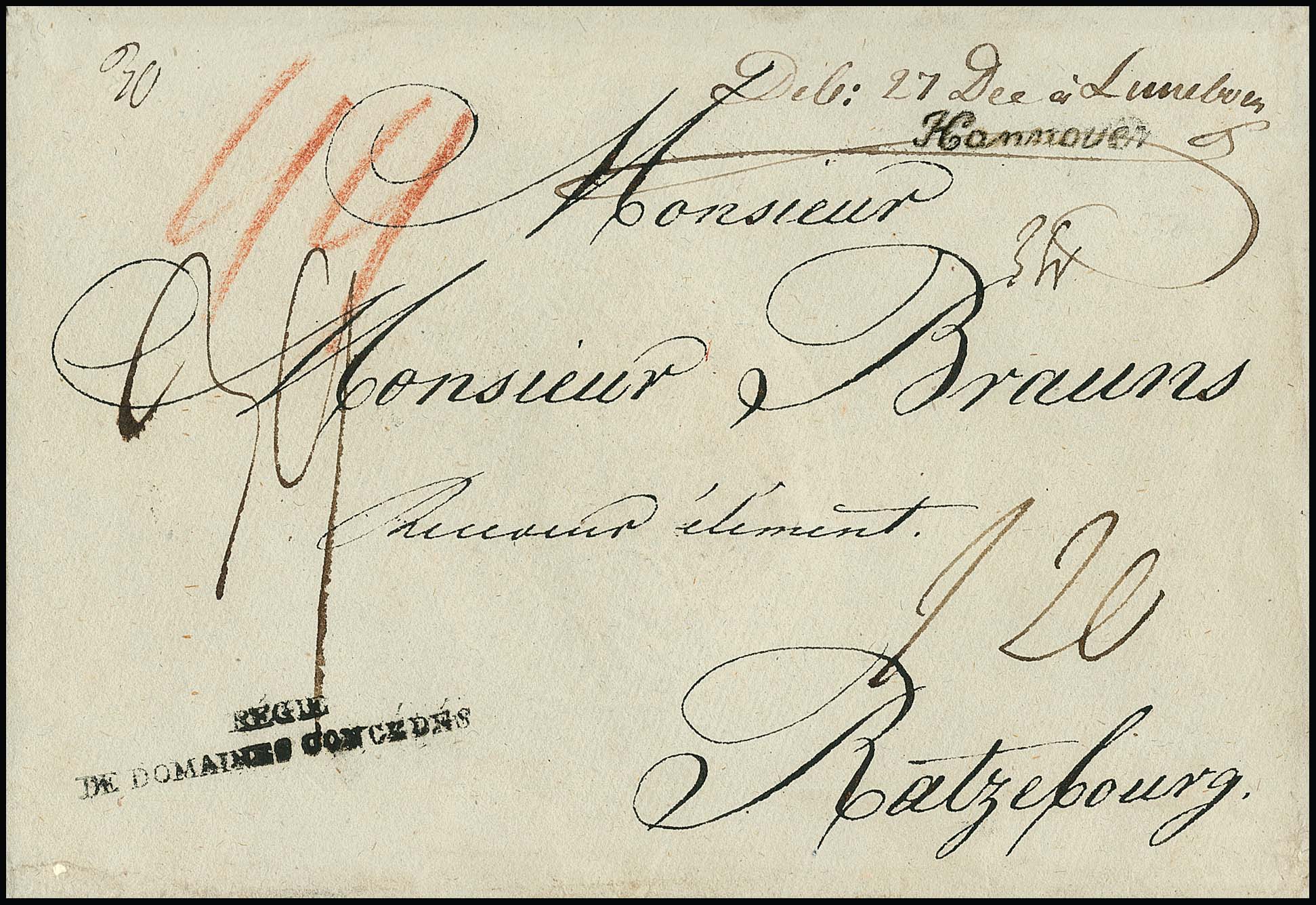 "Lüneburg", (1810), "DEB: 27 DEC. À LUNEBOURG" hs. vs. auf Prachtcouvert mit Schreibschrift-L1 "HANNOVER" und Franchise-L2 "REGIE DE DOMAINES CONCEDES" nach Ratzeburg