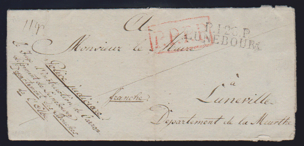 "Lüneburg", 1812, sauberer L2 "P.128.P. LUNEBOURG" auf Brief (Falten) nach Luneville, mit rotem Ra1 "P.P.P.P."