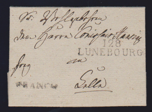 "Lüneburg", (1812), L2 "128 LUNEBOURG" nebst L1 "FRANCO" auf kleinem Kabinettbrief nach Celle, Inhalt ohne Datum