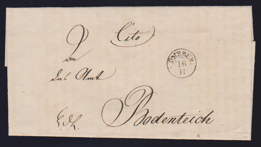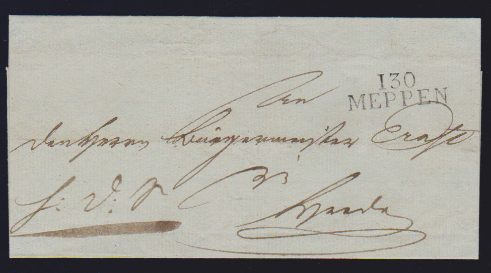 "Meppen", (1812), besonders klarer L2 "130 MEPPEN" auf dekor. Briefhülle nach Stade