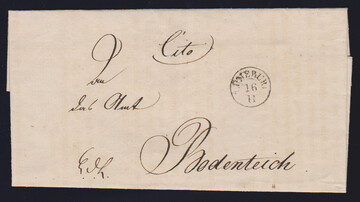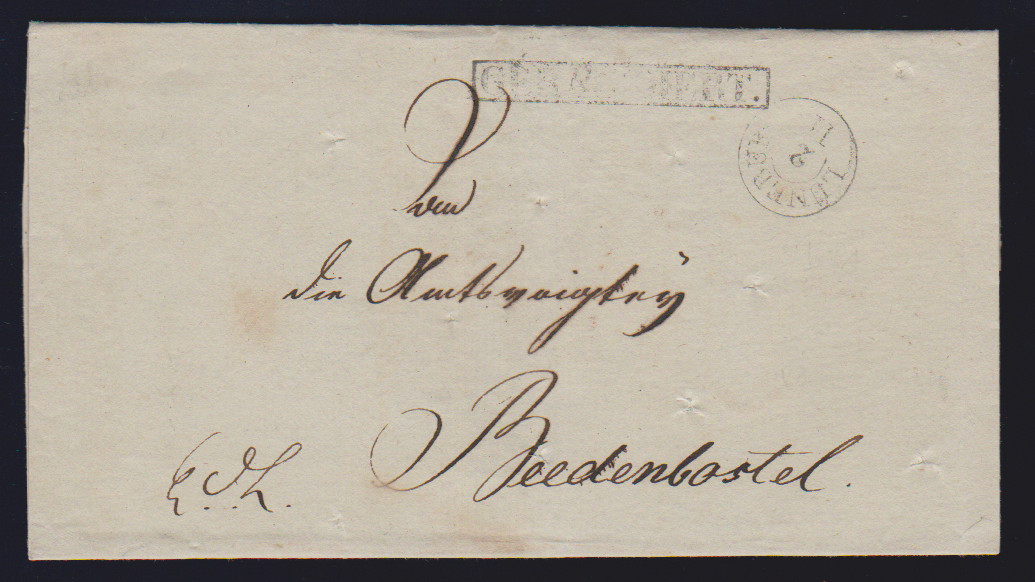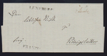 "Lüneburg", 1810, 12.10., L1 nebst L1 "FRANCO" sowie hs. "D`LÜNEBG." auf Kabinettbrief (gedruckter Inhalt) nach Königslutter, Lüneburg gehörte nur vom 1.8.1810 bis zum 13.12.1810 zum Königreich Westphalen, Belege aus dieser Zeit sind Raritäten