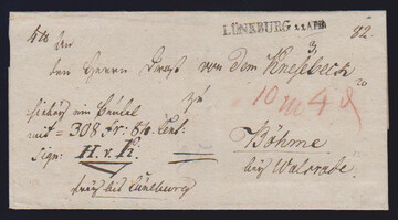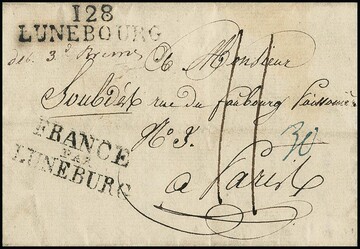 "Lüneburg", 1813, 1.5., L2 "LUNEBOURG" und L3 "FRANCE PAR LUNEBURG" je klar auf Kabinettbrief mit Inhalt nach Paris, ein sehr seltenes Poststück, Feuser 150,- + 1000,-