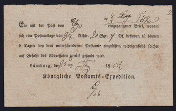 "Lüneburg", 1858, "Königliche Postamts-Expedition", seltener Abholschein (betr. Einlösung von 38 Reichsthaler 20 Ggr. und 4 Pfg. Auslage)