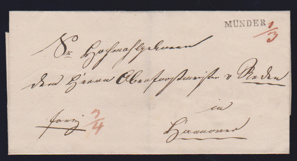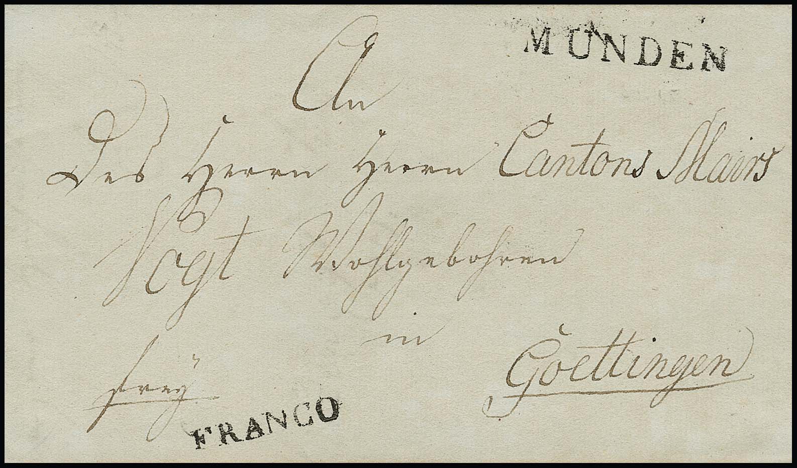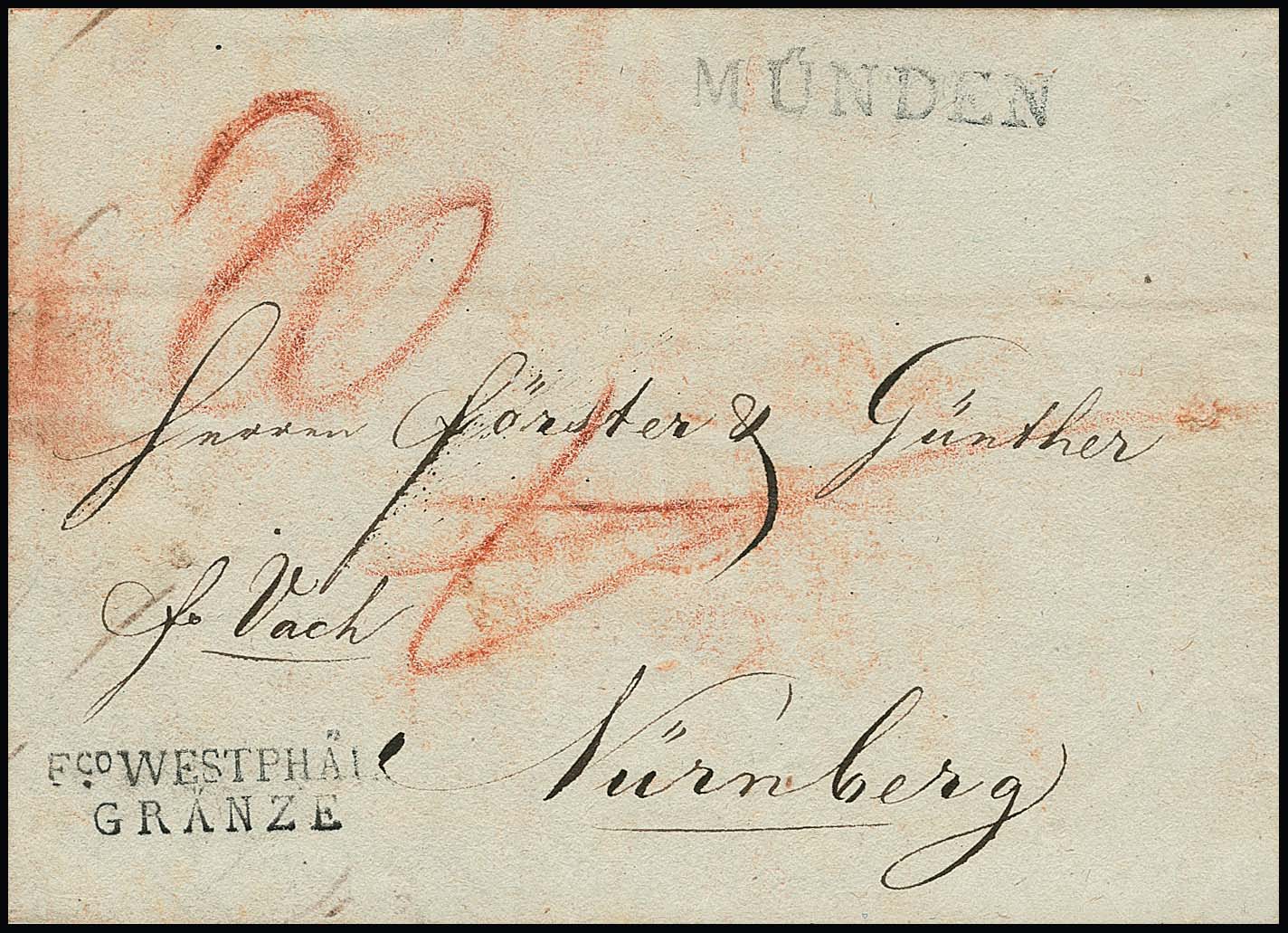 "Münden", 1811, klarer L1, nebst L1 "FRANCO" bzw. "F.CO. WESTPHÄL. GRÄNZE", auf zwei Prachtbriefen nach Göttingen bzw. Nürnberg