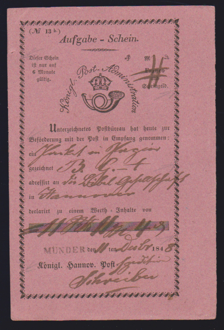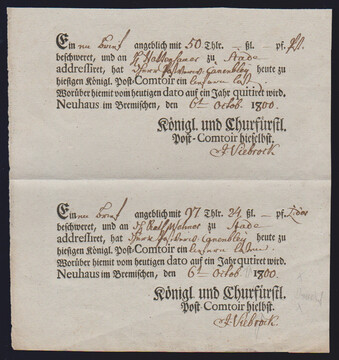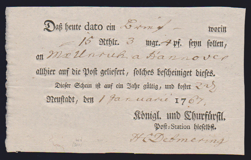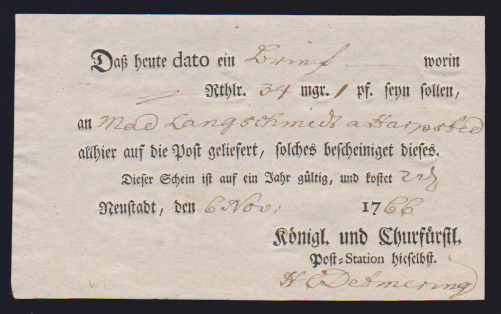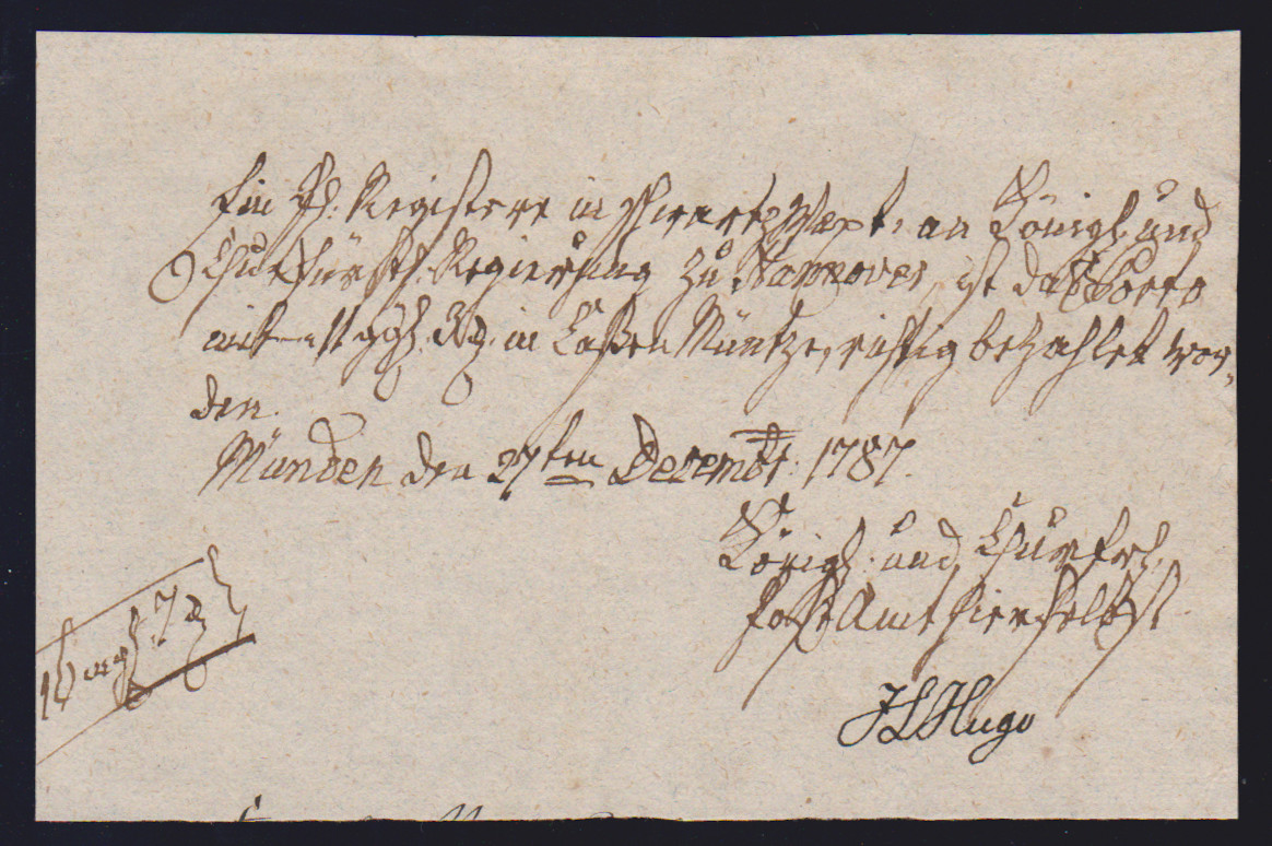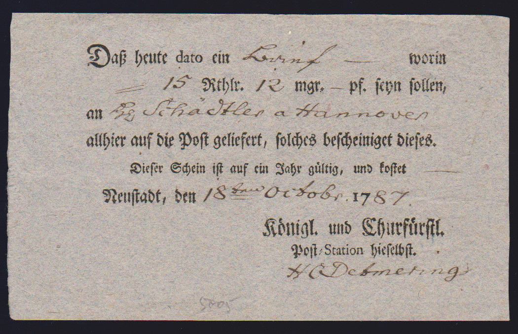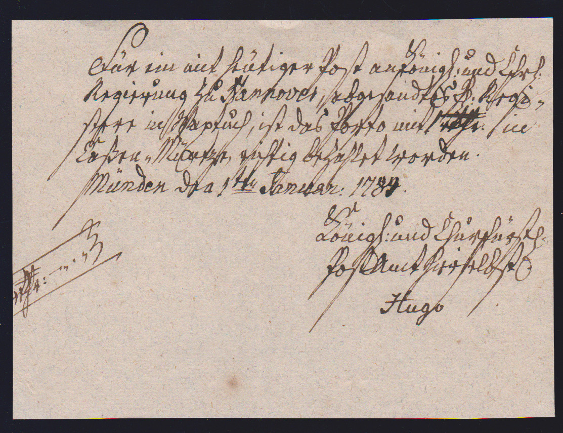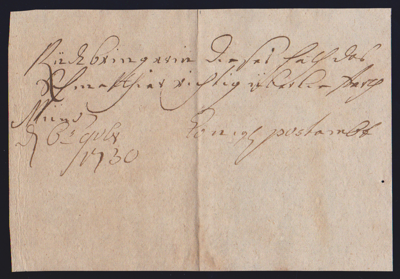 "Münden", 1725-1787, vier hs. Einlieferungsscheine des Königlich Churfürstlichen Postamtes