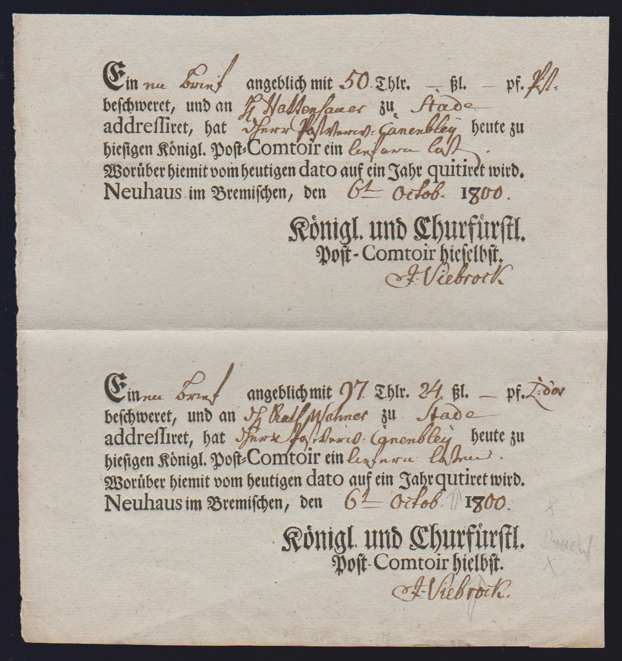 "Neuhaus im Bremischen", 1800, Ortsdruck-Postschein, Hb. W2, im seltenen senkr. Paar, einmal Druckfehler "qutiret" statt "quitieret