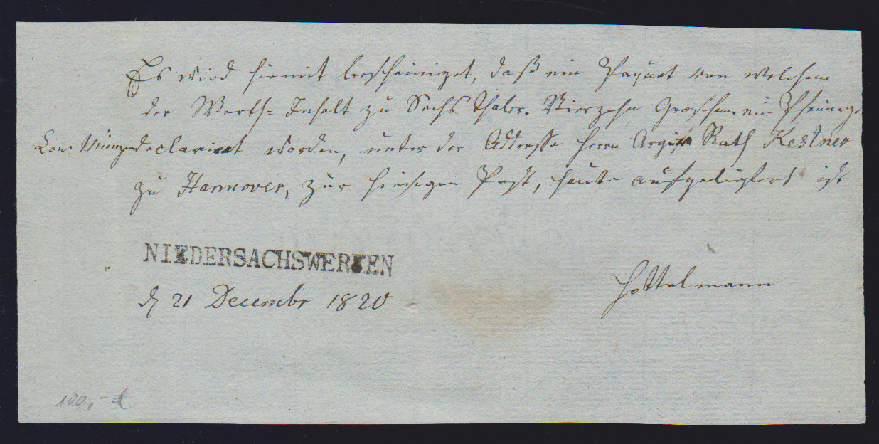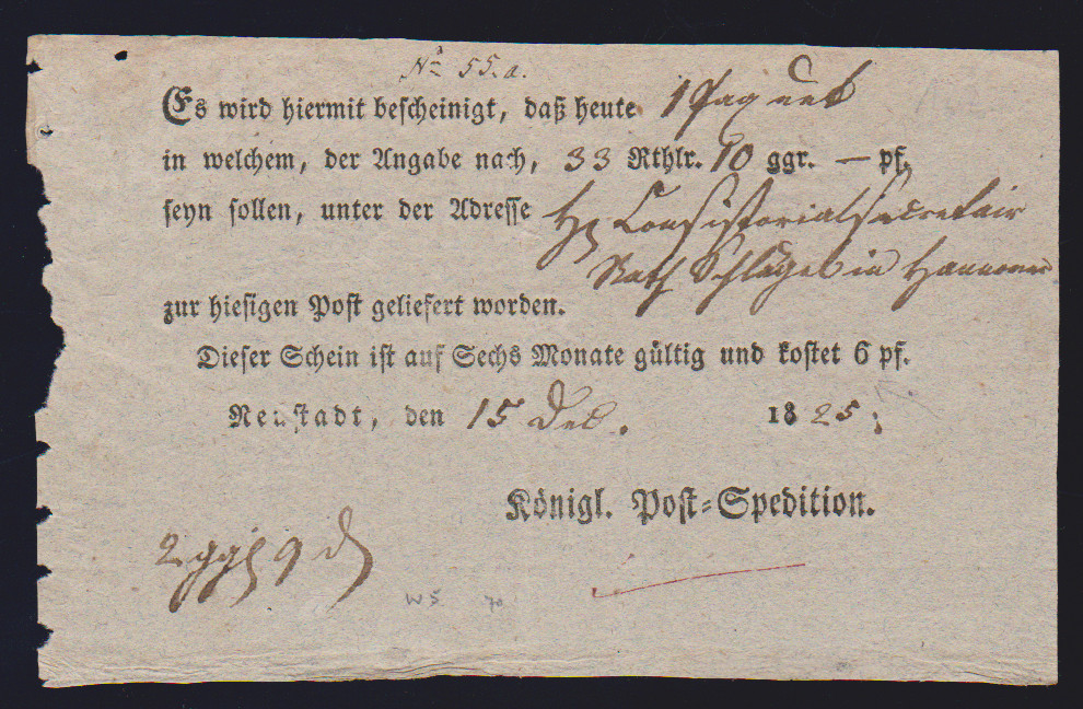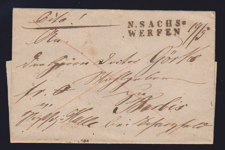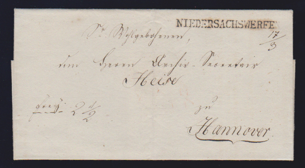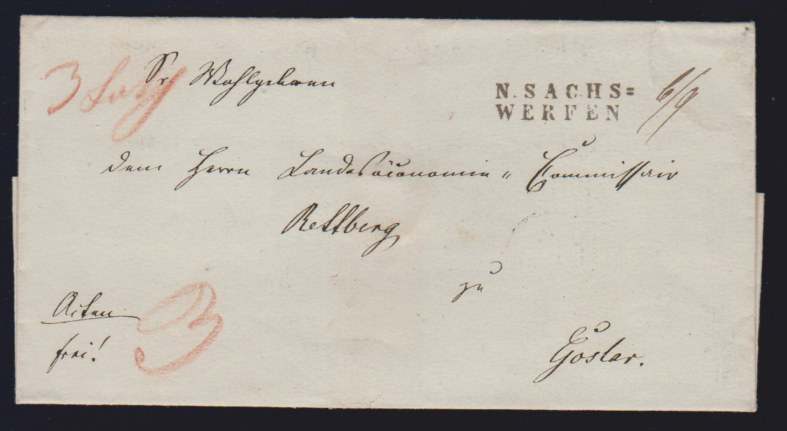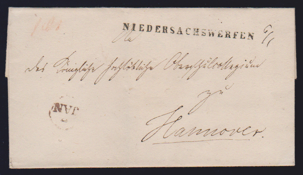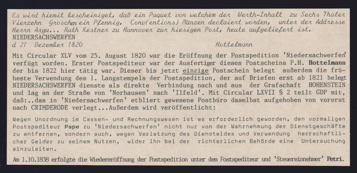 "Niedersachswerfen", 1820, 21.12., großer L1 (ArGe 01) klar auf hs. Postschein, ferner "N:SACHSWFEN.", sowie N.SACHS=WERFEN, L1 bzw. L2 klar auf drei dek. Briefhüllen nach Goslar (Postspedition eröffnet am 25.8.1820)