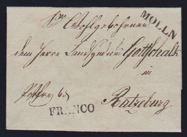 "Mölln", 1814, klarer L1 (einmal nebst L1 "FRANCO") auf zwei Kabinettbriefen nach Ratzeburg bzw. Scharnebeck, ArGe 01, 750,-