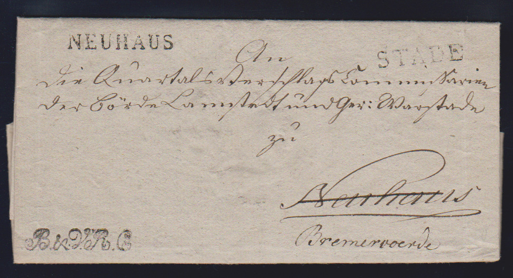 "Neuhaus" und "Stade", 1814, 8.4., je klare L1 nebst Franchise-L1 "B&V.R.C." auf Kabinettbrief nach Neuhaus und weiter nach Bremervoerde