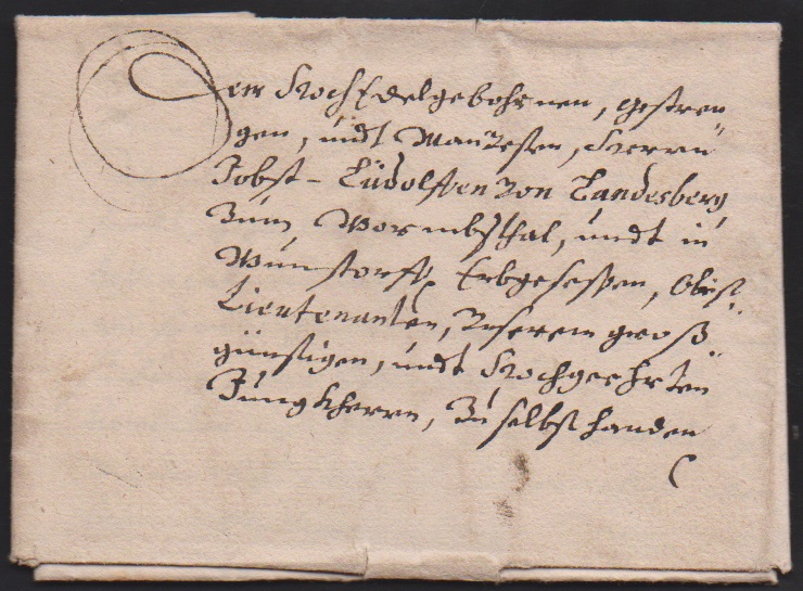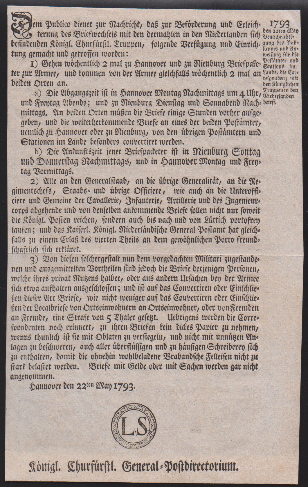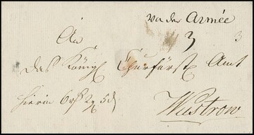 Feldpost, (1793), hs. "VON DER ARMEE" auf Wertbrief (Hülle) nach Wustrow, sehr selten (ex Slg. Kornhardt), rs. sehr schönes Lacksiegel des 2. Inf. Reg. von Traube, einzig bekanntes Stück (Erlass vom 22.5.1793 liegt bei)