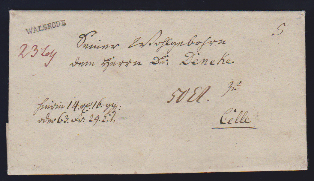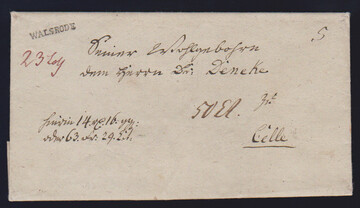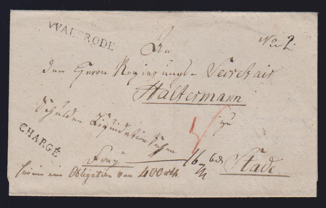 "Walsrode", 1814, 21.5., L1 nebst L1 "CHARGÉ" auf Wertbrief aus Fallingbostel nach Stade, dazu L1 (apt. Departementstempel) auf Paketbrief aus Einzingen nach Ottersberg (1823)