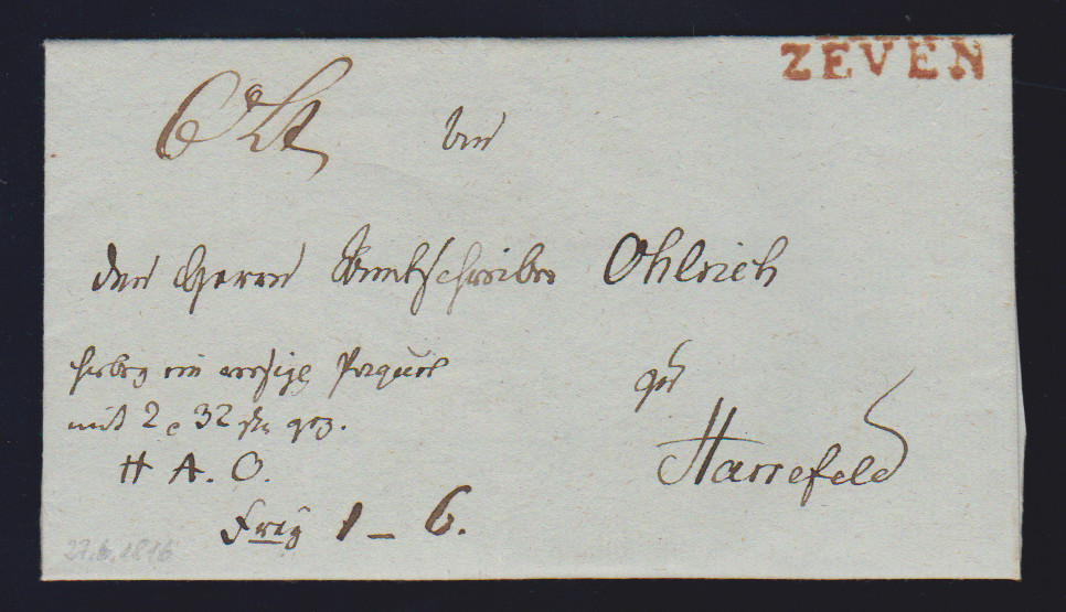 "Zeven", 1816, klarer roter L1 auf Luxus-Wertbrief nach Harsefeld, ArGe 04