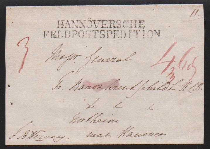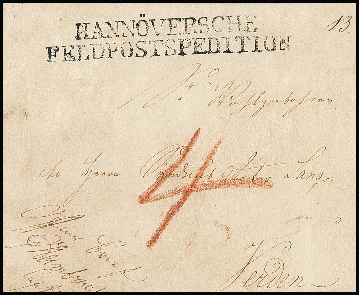 Feldpost, ca. 1815-1818, "HANNÖVERSCHE FELDPOSTEXPEDITION", je klare L2 auf zwei Briefhüllen nach Verden bzw. Nordheim, kleine Mängel