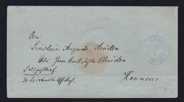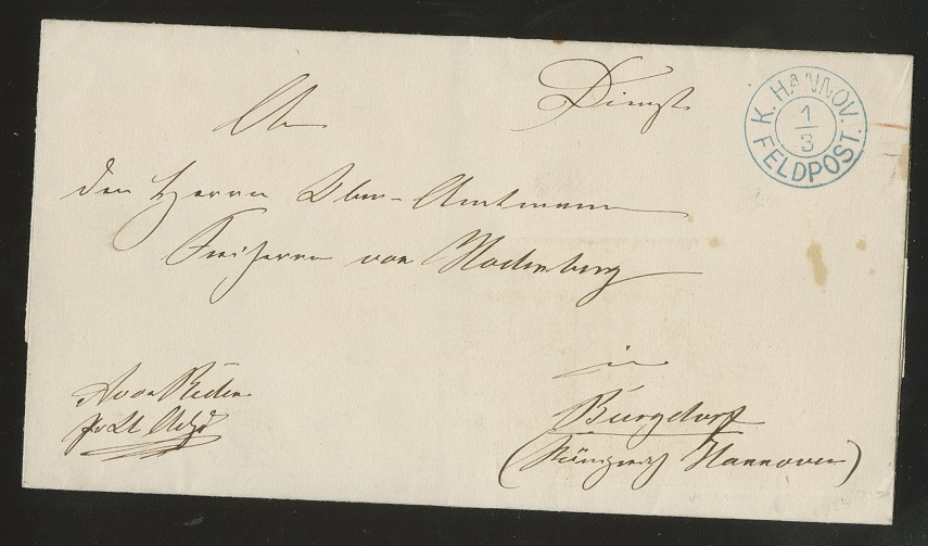 Feldpost, (1864), "K. HANNOV. FELDPOST", klarer blauer K2 auf Kabinett-Briefhülle nach Burgdorf (rs. K1)