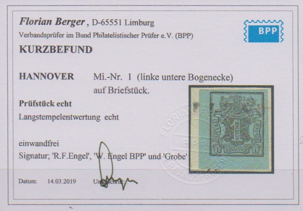 1 Ggr. schw./graublau, linke untere Bogenecke auf Kabinettbriefstück mit Langstempel, Fotoexp. Berger, sign. Grobe, Engel