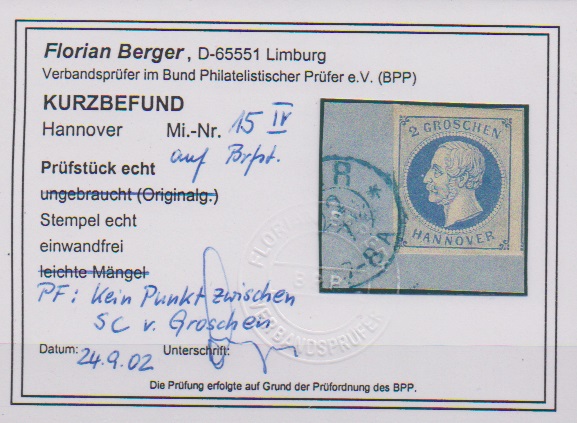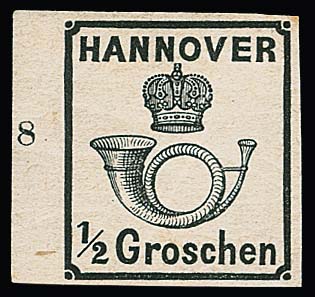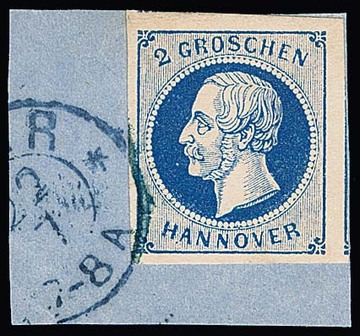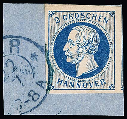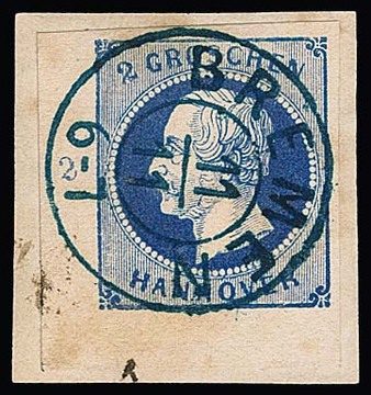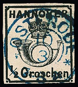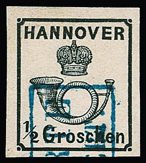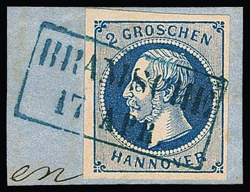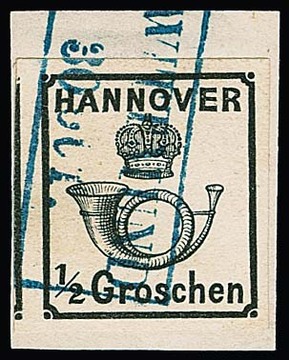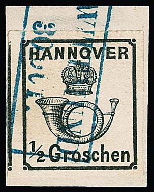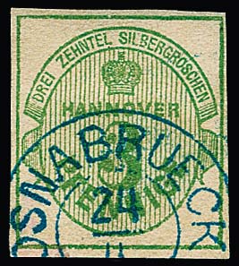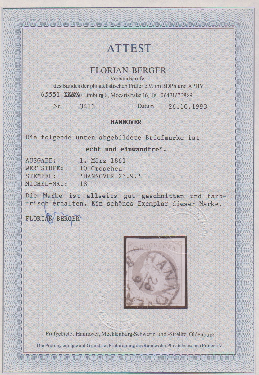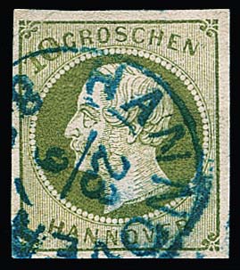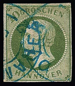 10 Gr. grün, Kabinettstück mit K2 "Hannover", Attest Berger "ein schönes Exemplar dieser Marke". Mi. 1700,-
