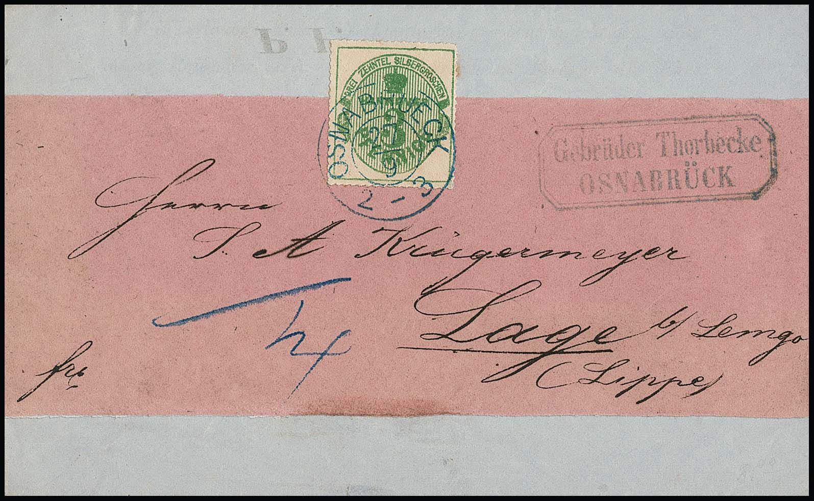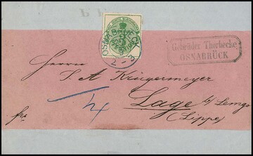 3 Pfge. grün, rosa Gummi, auf kompletter Kabinett-Drucksache, dekorative rosa Schleife mit Inhalt, mit K2 "Osnabrück" ins taxische Lage mit 1/4 Sgr. hs. Bestellgeld