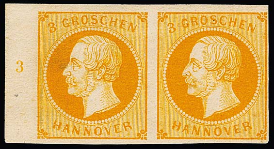 3 Gr. dunkelorange, ungebrauchtes linkes Kabinett-Randpaar mit Reihenzahl "3", von dieser Marke gab es keine sinnvollen Restbestände, anders als bei den anderen Kopfmarken. Mi. 500,- +