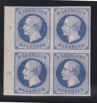 2 Gr. dunkelblau, postfrischer Rand-Viererblock mit Rz. "9" und "10", Mi. lose 160,- +