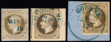 3 Gr. braun auf Kabinettbriefstück mit K2 "Gödens", ferner als überrandiges Randstück mit Rz. "3", sowie in fast graubrauner Nuance