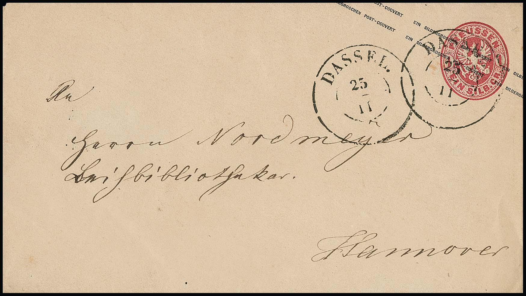 "Dassel", seltener nachverw. schwarzer K2 klar auf Preußen-Ganzsache 1 Sgr. rosa (v. 25.11.67)