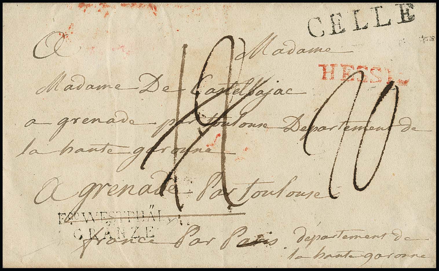 "Celle", 1813, L1 nebst rotem L1 "HESSE und schwarzem L2 "FCO. WESTPHÄL. GRÄNZE" auf Prachtbrief nach Grenade "par Toulouse" und "France par Paris"