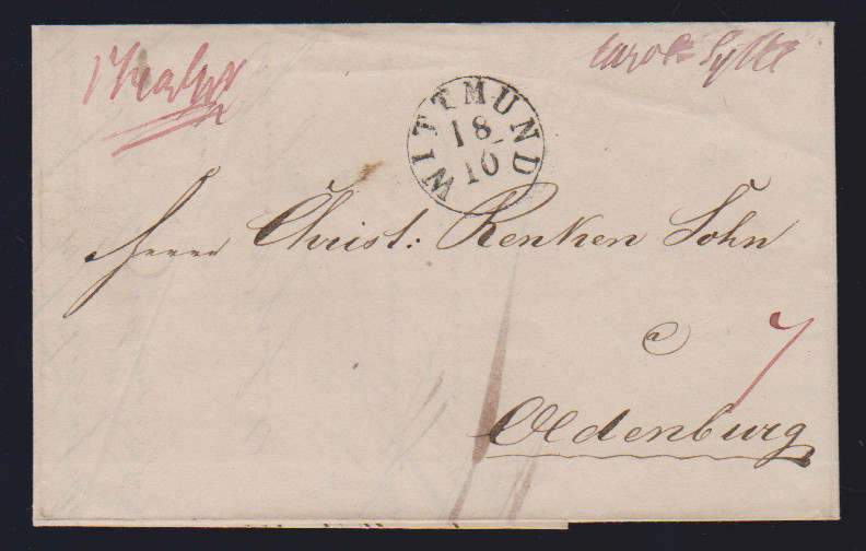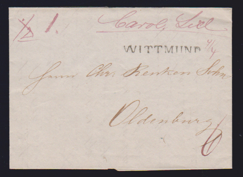 "Carolinensyhl", 1839-1842, je hs. in violetter Tinte nebst L1 bzw. K1 "Wittmund" auf vier Briefen nach Oldenburg