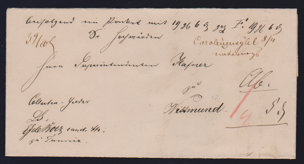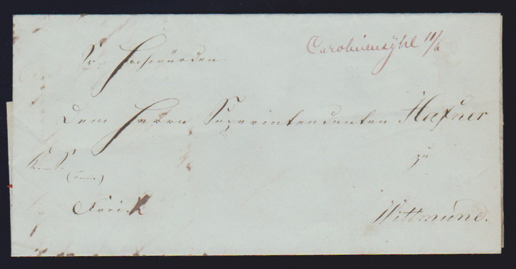 "Carolinensyhl", "Carolinensyhl Unterwegs" (auf Prachtbrief aus Funnix),1851/1863, je hs. auf zwei Kabinettbriefen nach Wittmund