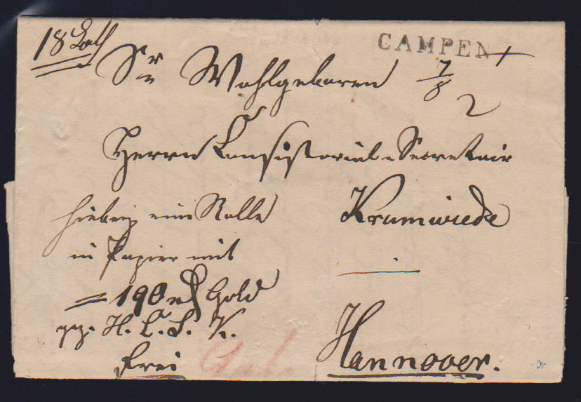 "Campen", ca. 1830-1840, verschiedene L1 bzw. hs. auf zwei Fahrpostbriefen (einer rs. unkpl.) nach Hannover, sowie auf lila Postschein von 1840