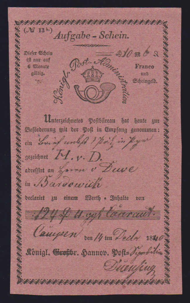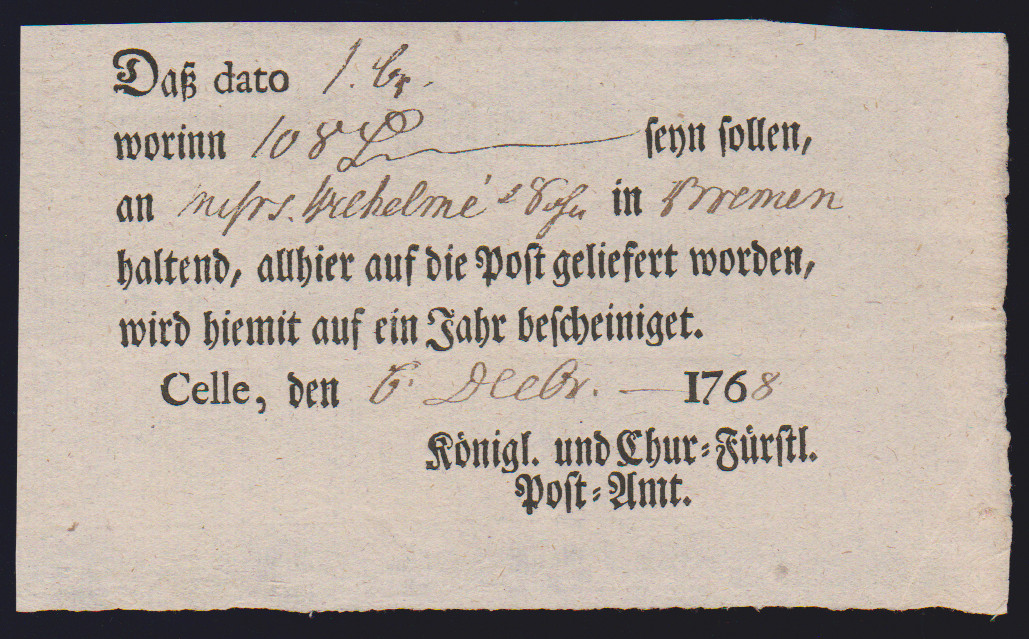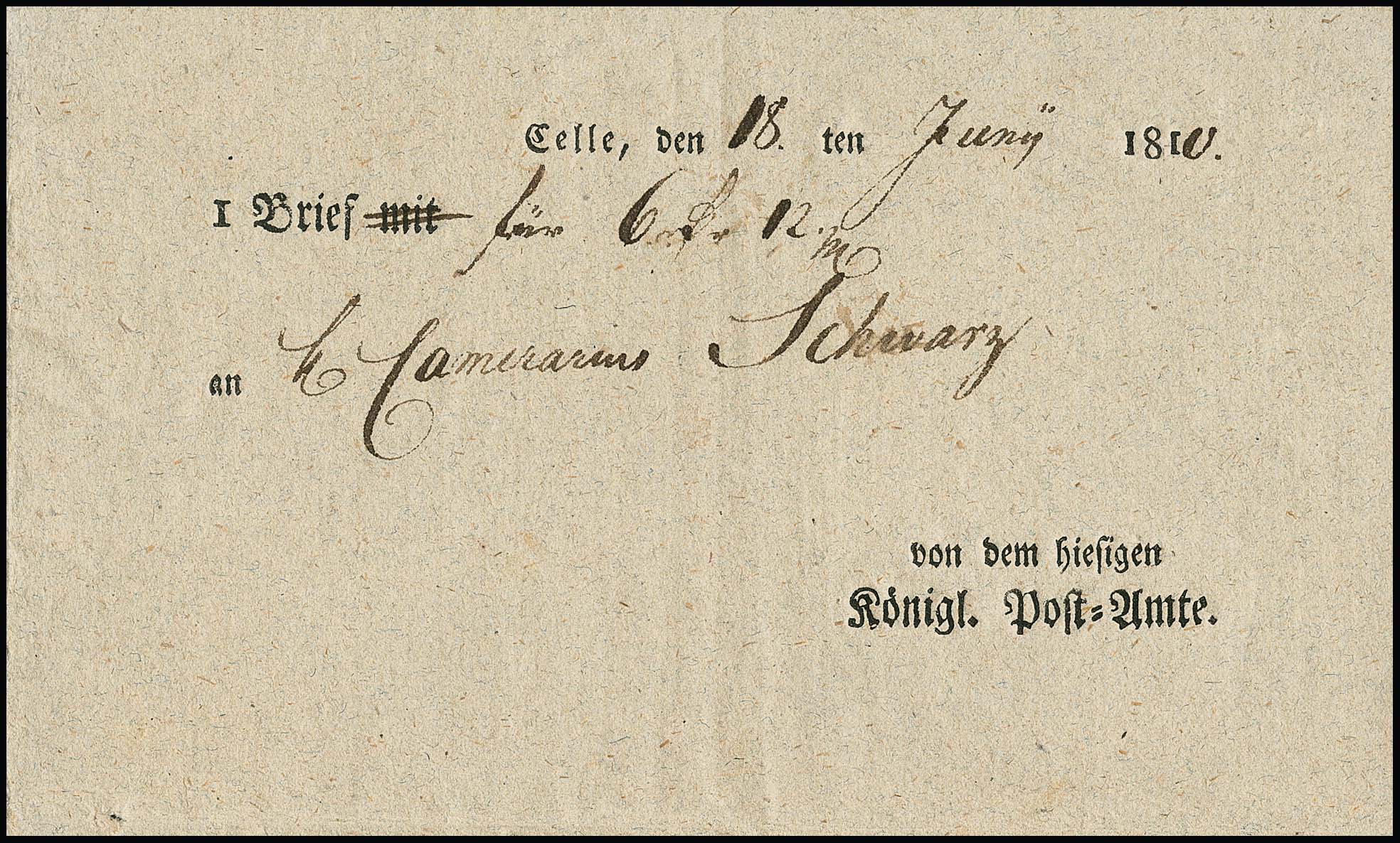 "Celle", 1810, "von dem hiesigen Königl. Post-Amte", sehr seltener westphäl. Ortsdruck-Ablieferungsschein für einen Wertbrief