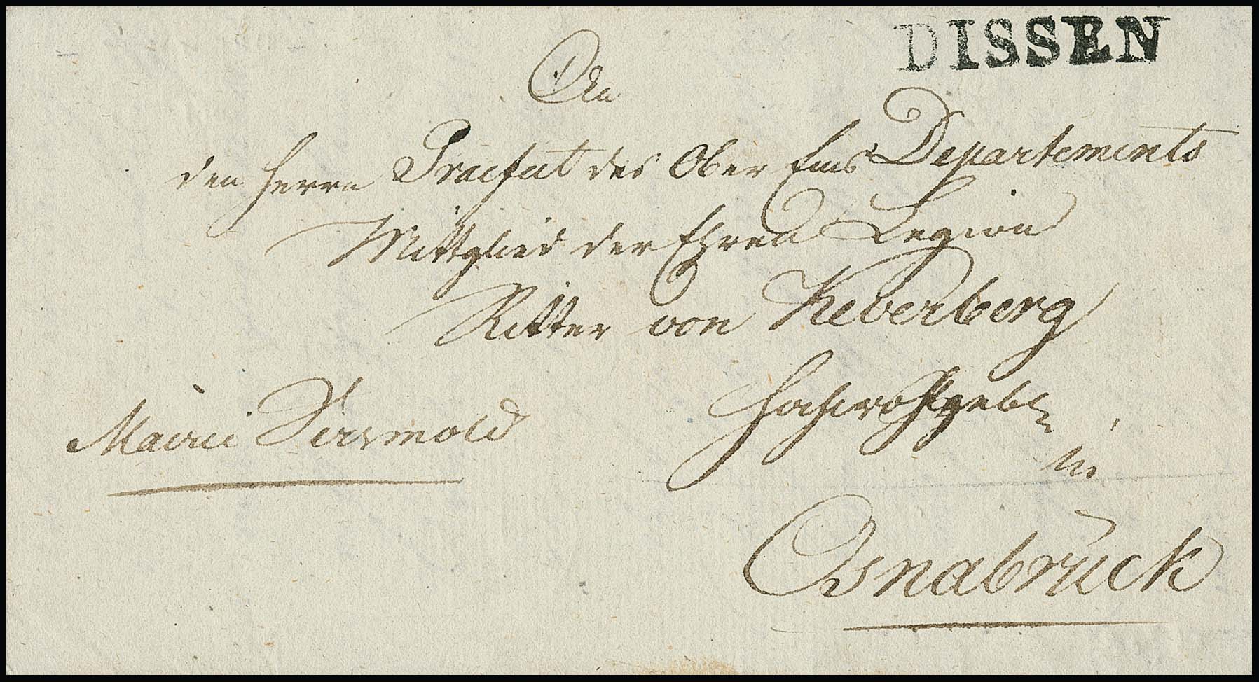 "Dissen", 1811, 29.5., großer westphäl. L1 auf Kabinettbrief aus Versmold (!) nach Osnabrück, in der westphäl. Zeit verwendet sehr selten (Inhalt betrifft Bereitstellung von Wagen und Bauarbeitern für Chausseearbeiten)