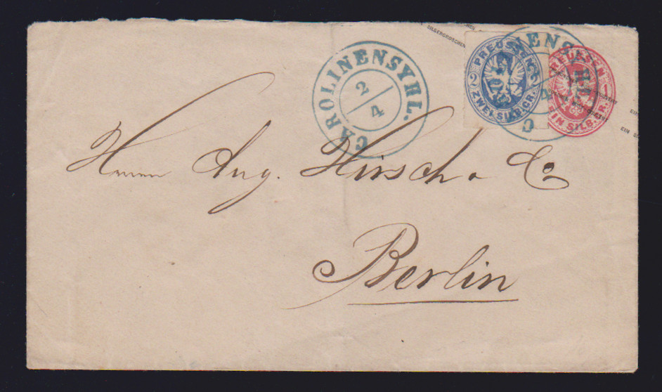 "Carolinensyhl", klarer nachverw. blauer K2 auf Ganzsache Preußen 1 Sgr. karmin nebst 2 Sgr. ultramarin nach Berlin