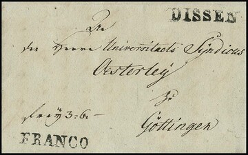 "Dissen", 1813, 28.9., großer westphäl. L1 nebst L1 "FRANCO" auf kleinem Luxusbrief nach Göttingen, dazu alleine auf Brief vom 30.8.1814 nach Oldenburg