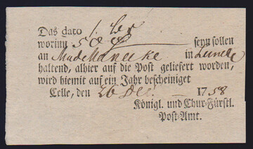 "Celle", 1758/1768, zwei seltene churfürstliche Ortsdruck-Postscheine, W4, 5, 300 P.