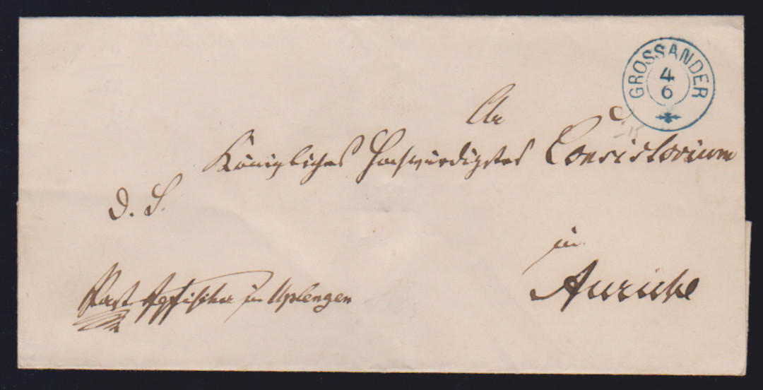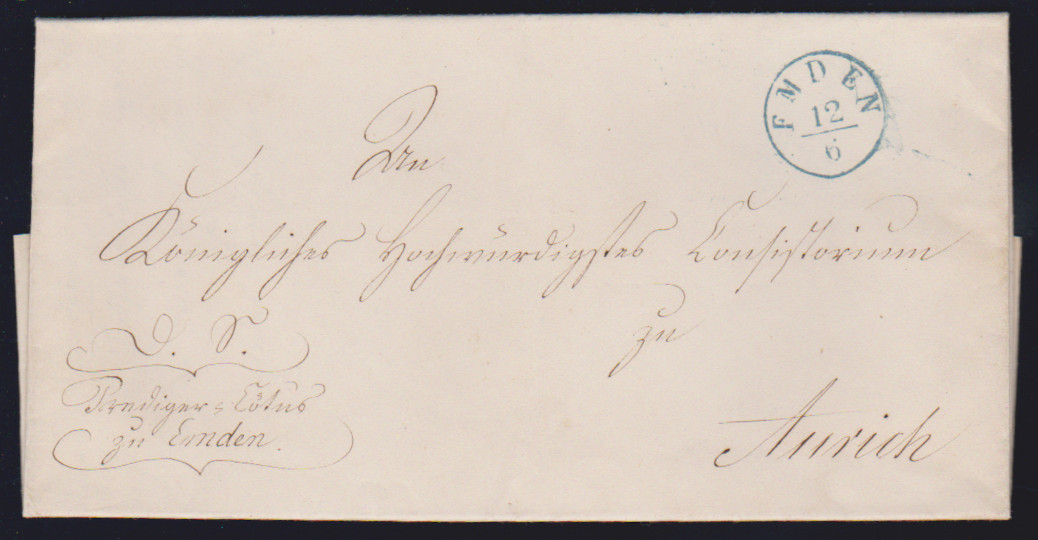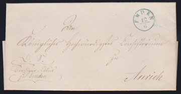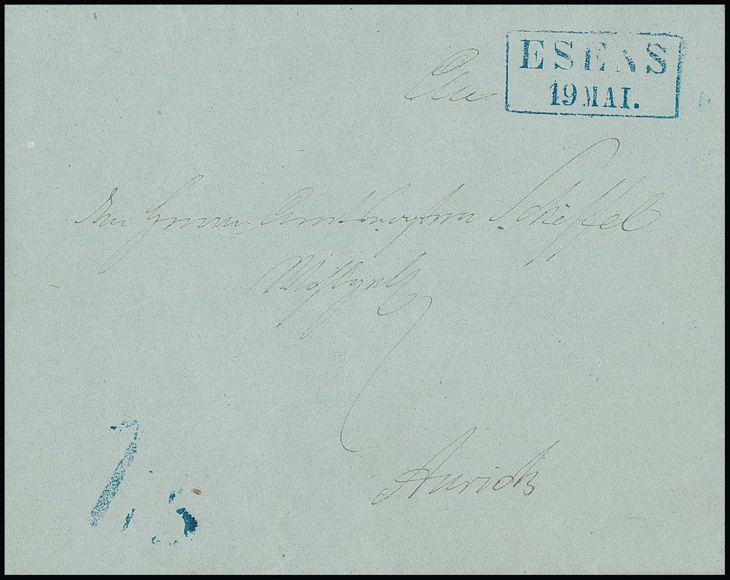 "Esens", (1860), blauer Ra2 nebst Taxstempel "1,5" auf Prachtbrief nach Aurich, sehr selten