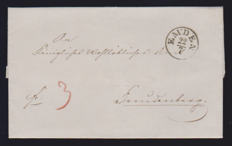 "Emden", 1850-1855, schwarzer, blauer und roter K1 auf drei Kabinettbriefen, ArGe 385,-